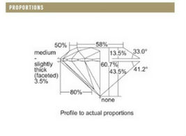 The diamond profile is shown to actual proportion and states the table percentage, crown angle, girdle thickness and depth percentage.