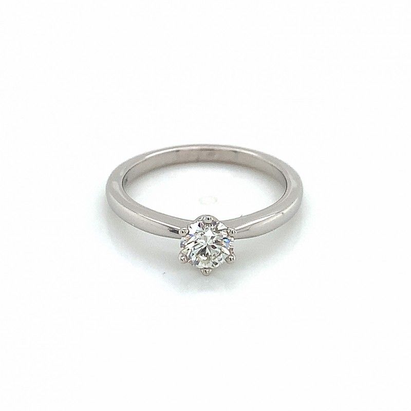 This ring feautures a stunning 0.503 carat round diamond in a beautiful 18k white gold setting. The diamond is held securely in six claws, while the half-round band is delicately pinched in at the shoulders.
