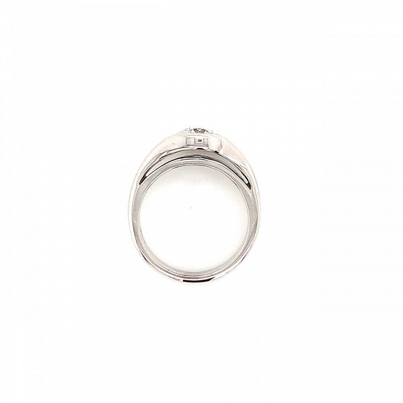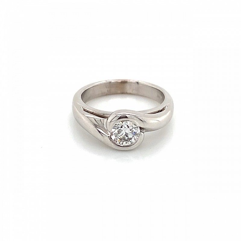 This ring feautures a stunning 0.578 carat E SI1 round diamond in a beautiful crossover style 18k white gold setting. The diamond is held securely in a rubover setting, showcasing and protecting the diamond.
