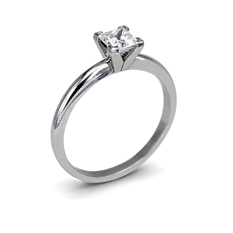This stunning platinum solitaire holds a 0.59ct E SI1 Princess cut diamond. The centre diamond is held securely by four V claws with a half round band.