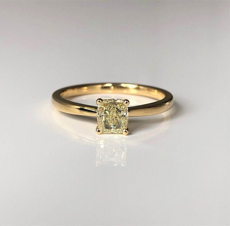 This stunning ring showcases a 0.710 carat natural yellow cushion cut diamond in our classic 'Madison' solitaire setting, in 18k yellow gold. This diamond has excellent polish, very good symmetry and is certified by GIA.