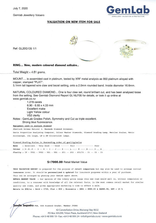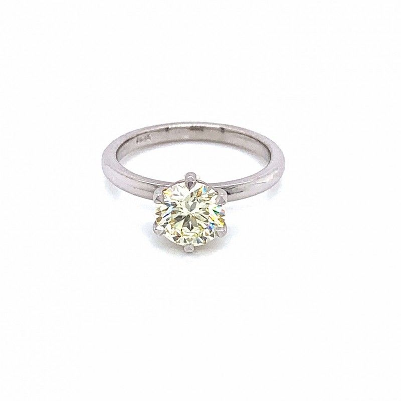 This natural round diamond weighing 1.278ct is held by six claws and the setting sits proudly on a half round non tapered band. Current ring size is L and can easily be resized up or down by 3 sizes if required.
